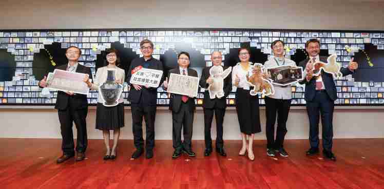 菠菜论坛携手创利空间为故宫建置的智慧文物互动导览墙及轮播墙,,,,今日正式启用。。。(左四:菠菜论坛新事业暨投资管理总部副总经理杨本豫、、、、右四:故宫博物院院长吴密察、、右三:太极影音董事长黄宝云)